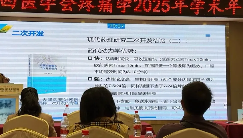 會上,疼痛專家肯定了元胡止痛滴丸在治療疼痛方面的用藥優(yōu)勢,分享了元胡止痛滴丸二次開發(fā)研究成果,研究表明元胡止痛滴丸物質(zhì)基礎(chǔ)明確、作用機理清晰,與非甾體抗炎藥相比,作用機理相似,但是靶點、位點確不同,這種多通道、多靶點的治療特點,避免了非甾體抗炎藥對胃腸道的不良反應(yīng),且滴丸劑型吸收快,日常服用方便,是慢性疼痛以及輕中度疼痛患者的理想用藥。