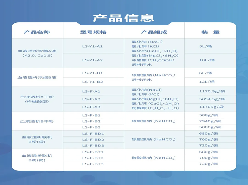 公司申請注冊成功的“血液透析濃縮液”和“血液透析干粉”均屬于血液透析濃縮物,產(chǎn)品醫(yī)療器械分類編碼為10-04-01,適用于急性腎衰竭、慢性腎衰竭的血液透析治療,已被臨床大量應用。此次注冊通過的產(chǎn)品離子濃度型號為“鉀2.0、鈣1.5”型,擁有1人份、2人份裝量,能滿足絕大多數(shù)患者與透析中心的使用需求。